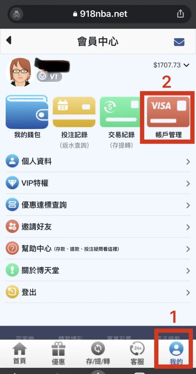 步驟3:於網站下方選單點擊我的(會員專區),點擊帳戶管理