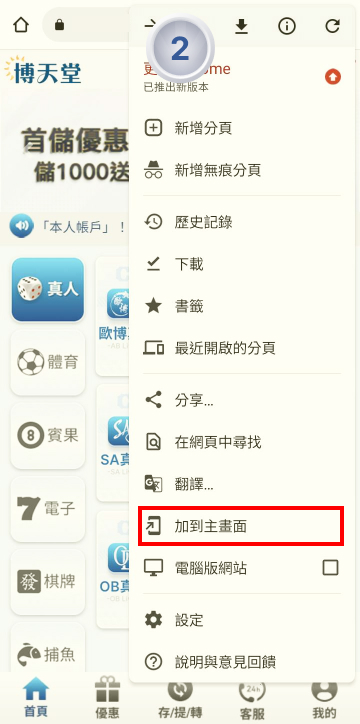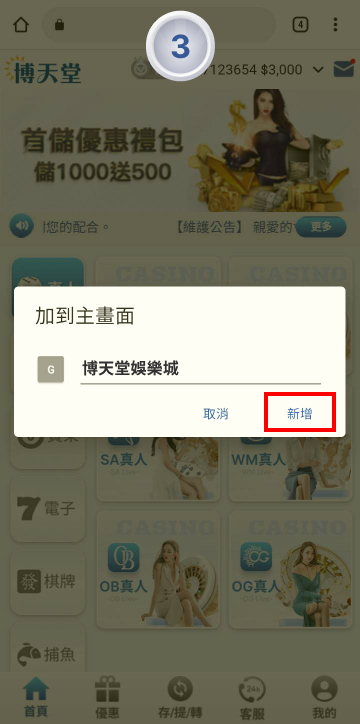 點擊新增,即可增加線上賭博app官網至手機主頁面