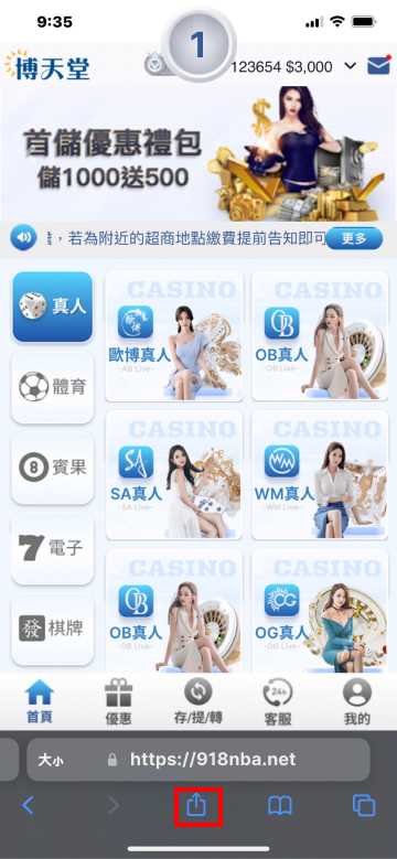 使用Safari瀏覽器,開啟線上賭博app網頁,點擊右上方紅框內'圖標'