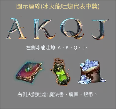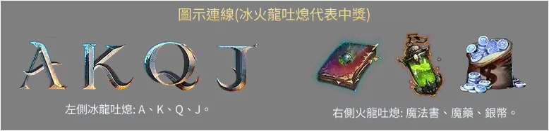 冰龍的負責範圍:冰龍吐息將根據賠付線連線規則銷毀英文字母的部分(AKQJ)並獲得彩金。AKQJ分別代表的賠率如下: